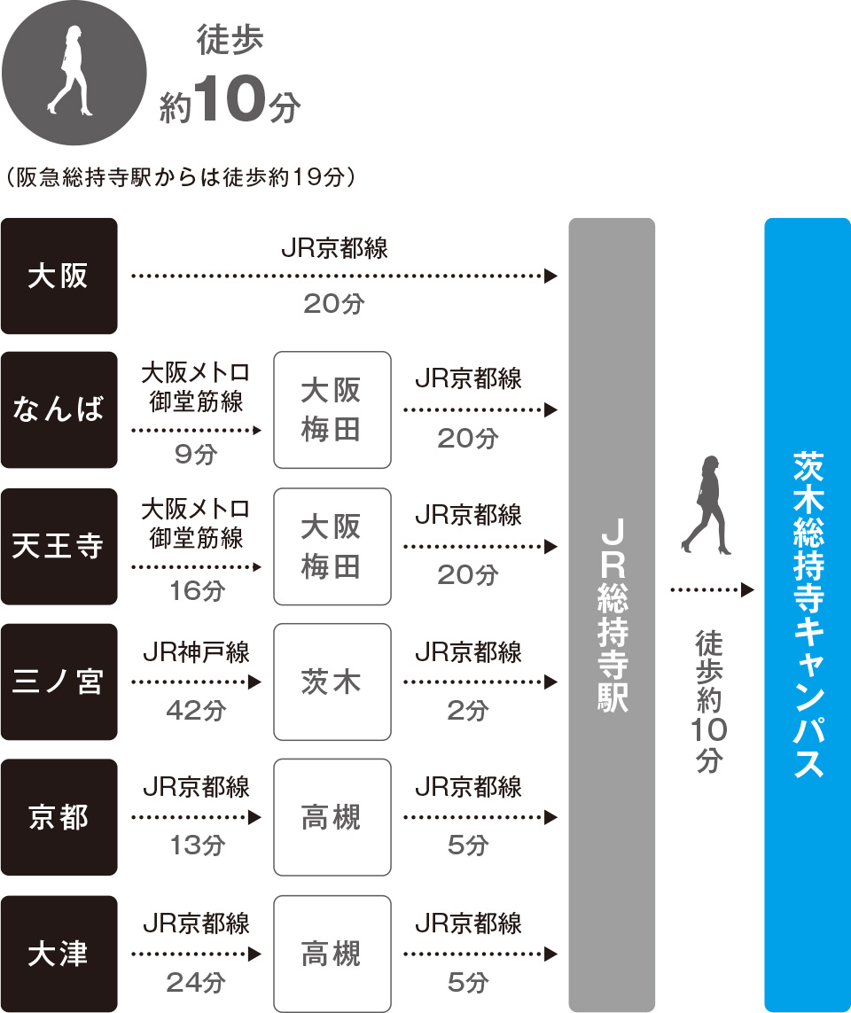 阪急茨木市駅から近鉄バスがキャンパス前まで運行しております。(乗車時間約18分)
