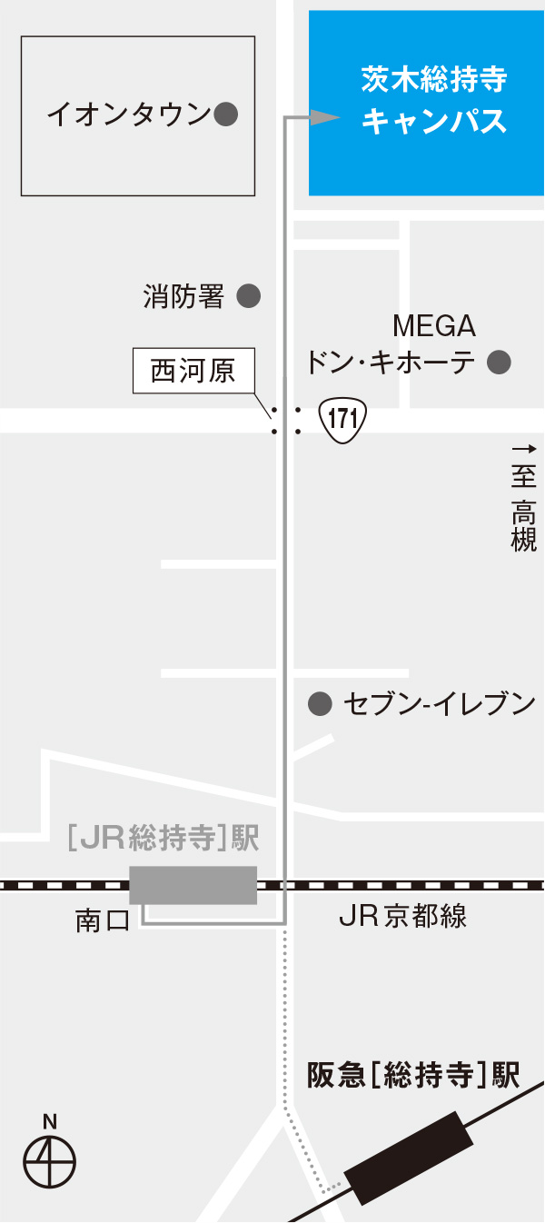 茨木総持寺キャンパスには駐車場がありません。公共交通機関でのご来校にご協力をお願いいたします。周辺にはコインパーキングもいくつかございます。