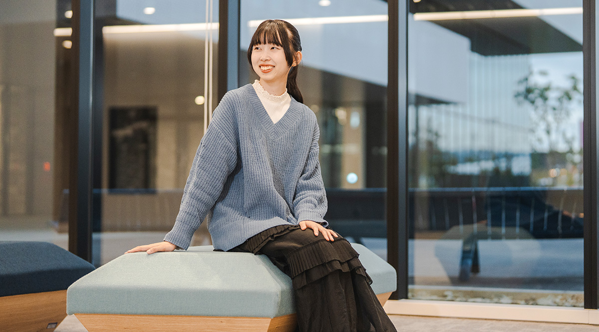 お気に入りの場所は、アカデミックアークのWILホールの吹き抜けエリアと、アカデミックベースのフリースペース。仲間とパソコンを囲んでアイデアを出しあい、時にはTVから音楽を流してサークルの宣伝をすることも。図書館のソファに座って一人で過ごす時間も大切にしています。居心地のいいスペースが多いおかげで、学びとリフレッシュの切り替えがしやすく、毎日を気持ちよく過ごせています。